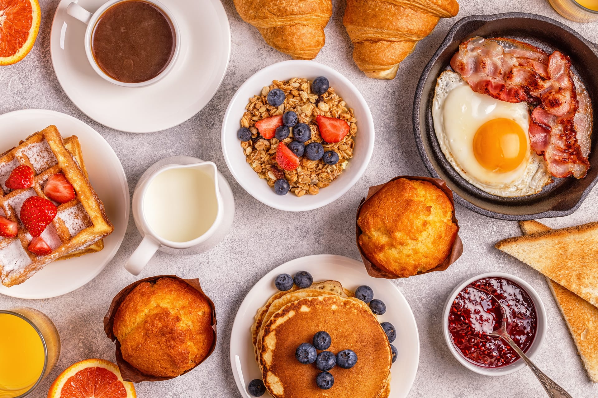 Από την άλλη, για τους λάτρεις της γλυκιάς γεύσης υπάρχουν εξίσου ποικίλες επιλογές όπως είναι τα pancakes, οι βάφλες, τα κρουασάν ή τα κέικ τα οποία συνήθως σερβίρονται με σοκολάτα, κάποιο σιρόπι, μέλι, μαρμελάδα ή φρέσκα φρούτα.
