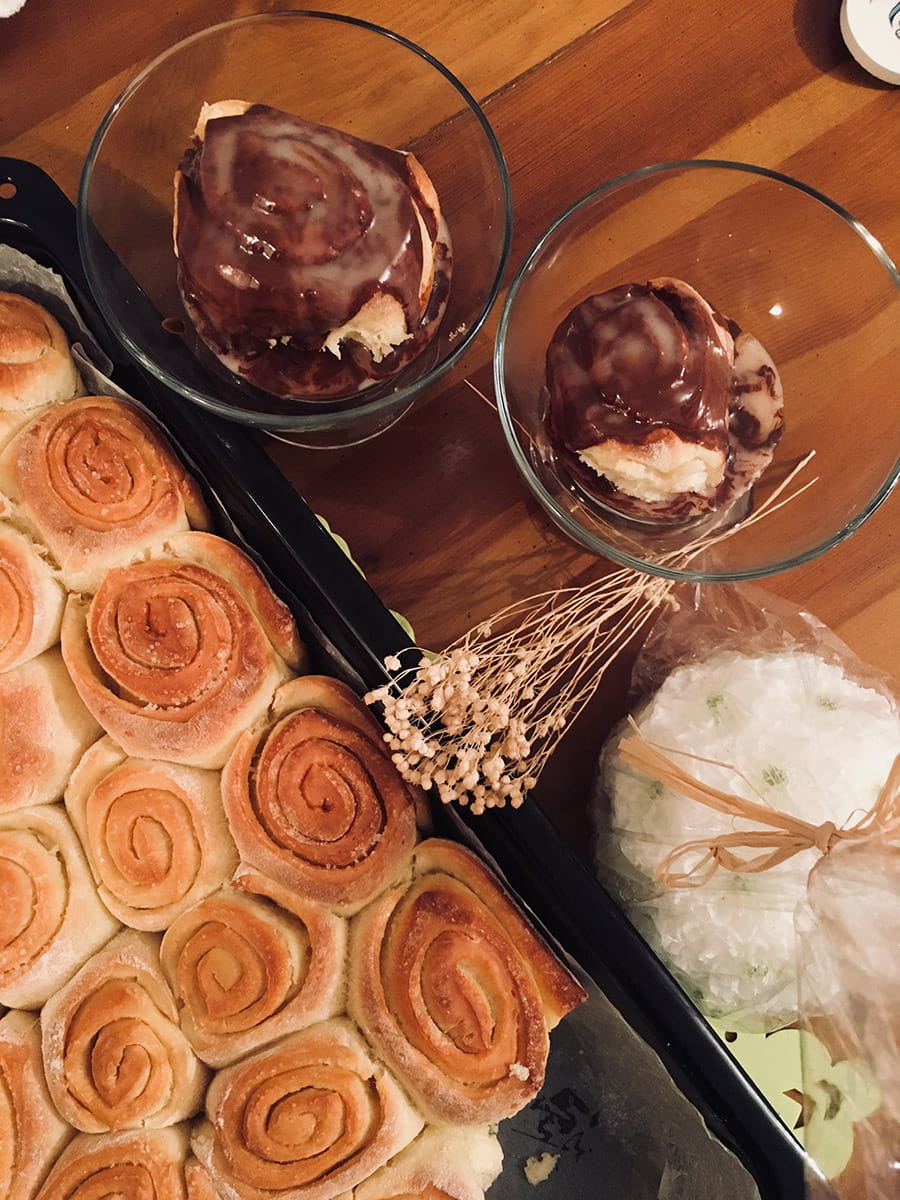 Βάλτε τα ρολά κανέλας οριζόντια σε αντικολλητικό χαρτί ψησίματος σε ταψί. Ψήστε για περίπου 20 λεπτά μέχρι να ροδίσουν. Έτοιμα!